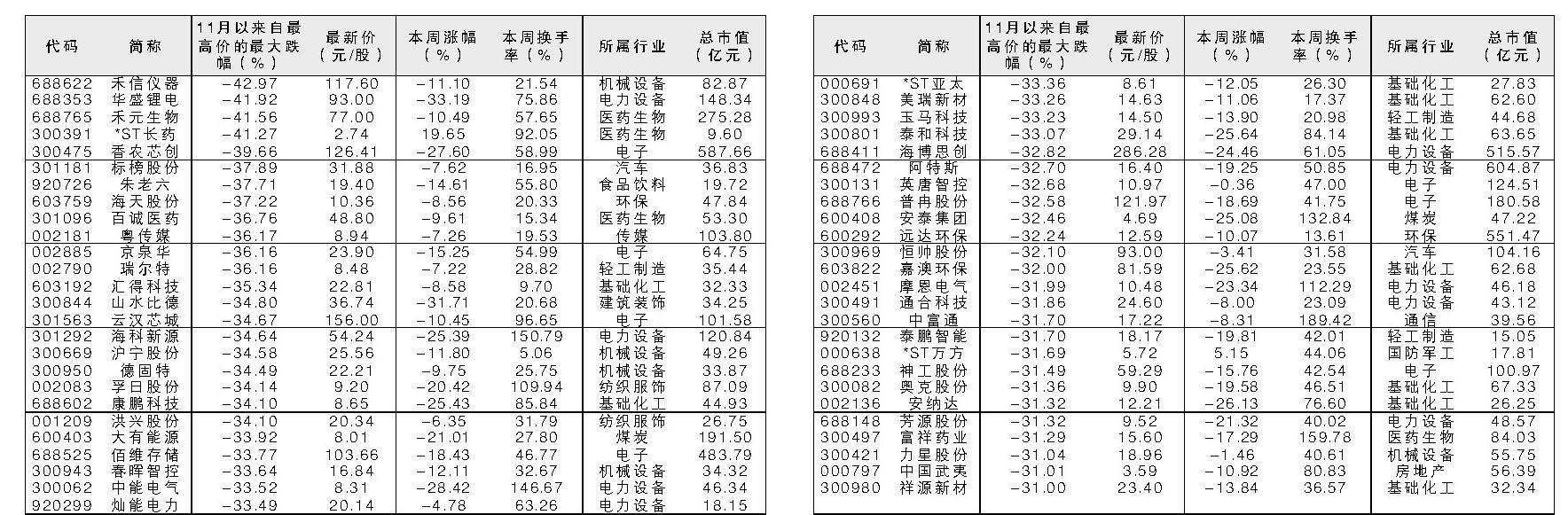本周市场出现调整,周五个别此前跌幅较大的个股出现反弹,比如禾信仪器股价出现涨停。根据Wind数据统计,截至11月21日,51股股价较11月最高价回撤超过31%。市场人士表示,超跌后的反弹仍需要关注基本面、消息面上的变化。